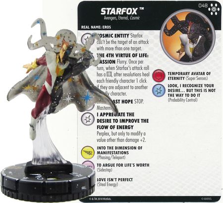 10 AV is not what you want to see from your 12 Hypersonic attacker, but it will put your opponent at ease — she’s not that scary. But she gets more useful when you make that Leadership roll to suddenly gain up to 5 or 6 extra squares of swing (via her balanced and Nifty SP to place her within X squares in line of fire with a good Leadership and Shape Change roll). 19 Super Senses DV is darn good, too, if the SC roll fails. She also has the Avengers Infinity trait that boosts her attack and damage when targeting 100+ pointers. Finally, her late dial has Defend and Prob to help the team.